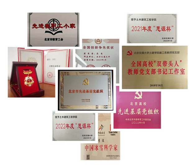 近年来,集体曾先后获评全国高校“双带头人”教师党支部书记工作室(全校唯一)、2个“全国党建工作样板支部”(占全校1/3)、全国高校黄大年式教师团队(占全校1/2)、全国高校“百个研究生样板党支部”(占全校1/2)、北京市先进基层党组织(全校唯一)、2个北京高校先进基层党组织、北京高校德育工作先进集体、北京市教育工会先进教职工小家等荣誉称号,入选北京市教工委主编的《党支部工作规范》典型案例(全校唯一)、北京教工委十个高校教师党支部工作法试点单位(全校唯一)、北京高校100个支部工作法3个(占全校3/8),公司师生党员曾获评全国创新争先奖、全国高校百名研究生党员标兵(全校唯一)、首都劳动奖章、首都精神文明建设奖、北京市优秀共产党员、全国科普工作先进工作者、北京高校优秀共产党员、北京青年五四奖章、全国铁路优秀共青团干部、北京高校就业工作先进个人等荣誉称号。