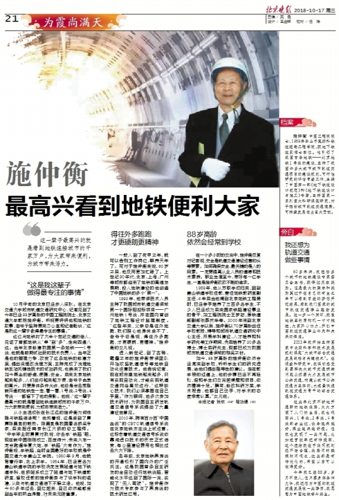 这位与地铁打了大半个世纪交道的老人,见证了首都地铁从“单”到“多”,再走向四通八达。当年北京修建我国第一条地铁——1号线时,他就是前期试验段的技术负责人。当年正是他据理力争,改变了这条地铁的修建方案,提出深埋改浅埋方案,主持完成了浅埋地铁车站关键性技术的试验研究,也换来了我们如今乘坐的舒适、便捷、安全。后来北京地铁越来越多,人们出行越来越方便,老爷子由衷的高兴。只要身体条件允许,他总是会去那些新开通的地铁走一走,看一看,1号线、2号线、4号线……都留下了他的身影。他说:“这一辈子最高兴的就是看到地铁连接城市的千家万户,为大家带来便利,为城市带来活力。”
