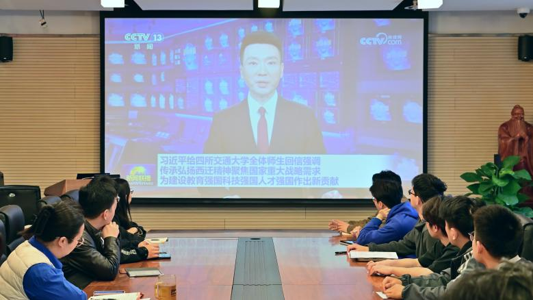 与会人员共同观看了《新闻联播》关于习近平总书记回信的新闻视频。观看过程中,大家聚精会神、认真聆听。习近平总书记在回信中的殷殷嘱托,让在场的每一位交大人倍感振奋,进一步增强了作为交大学子的自豪感、使命感和责任感。